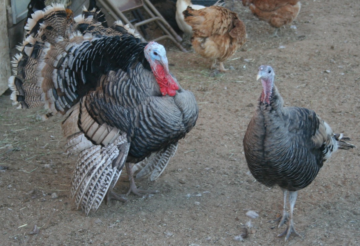 This is a free-range male (puffed) and female turkey. We also sell turkey chicks if available. ย Please call for pricing information and availability.